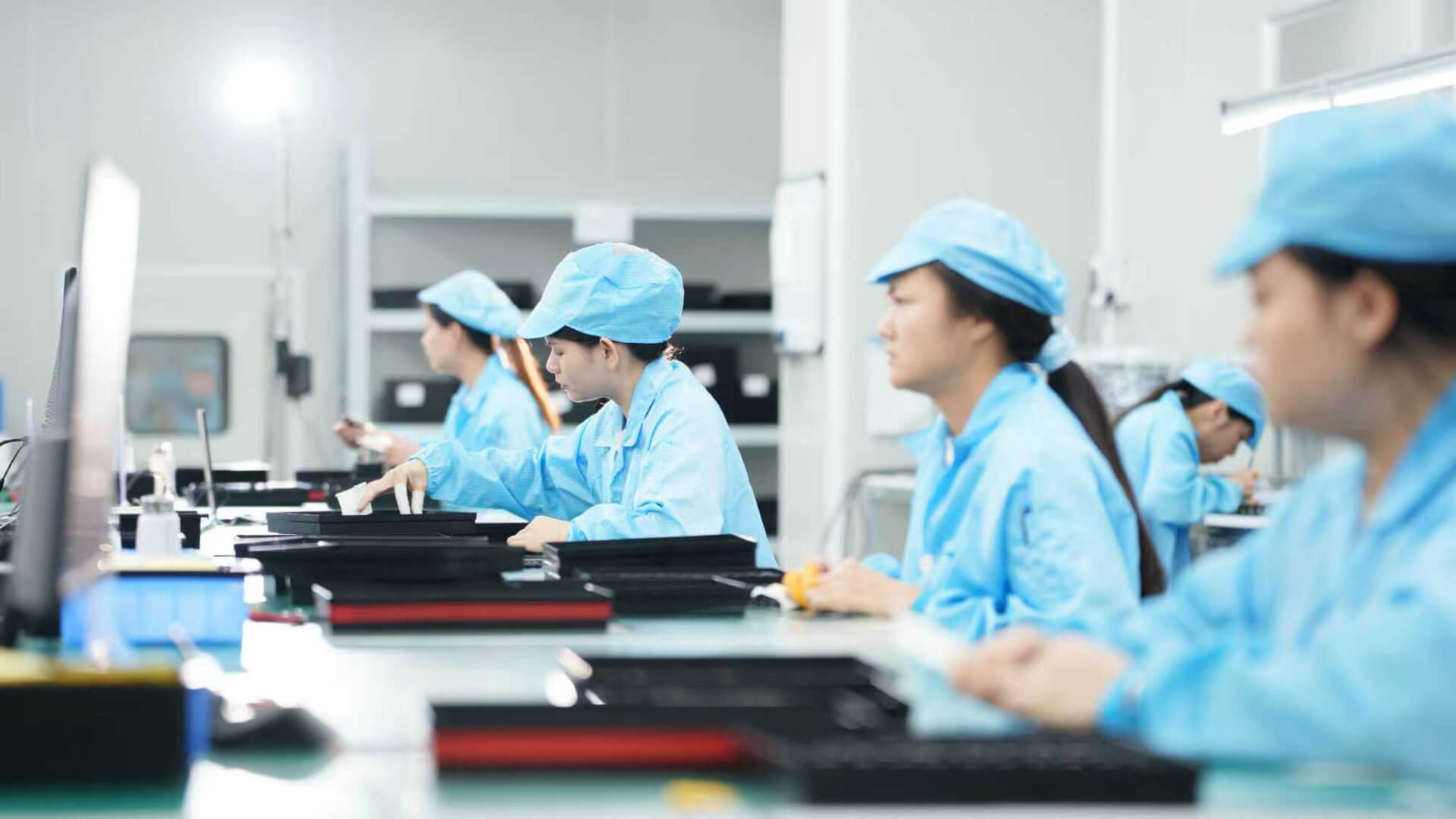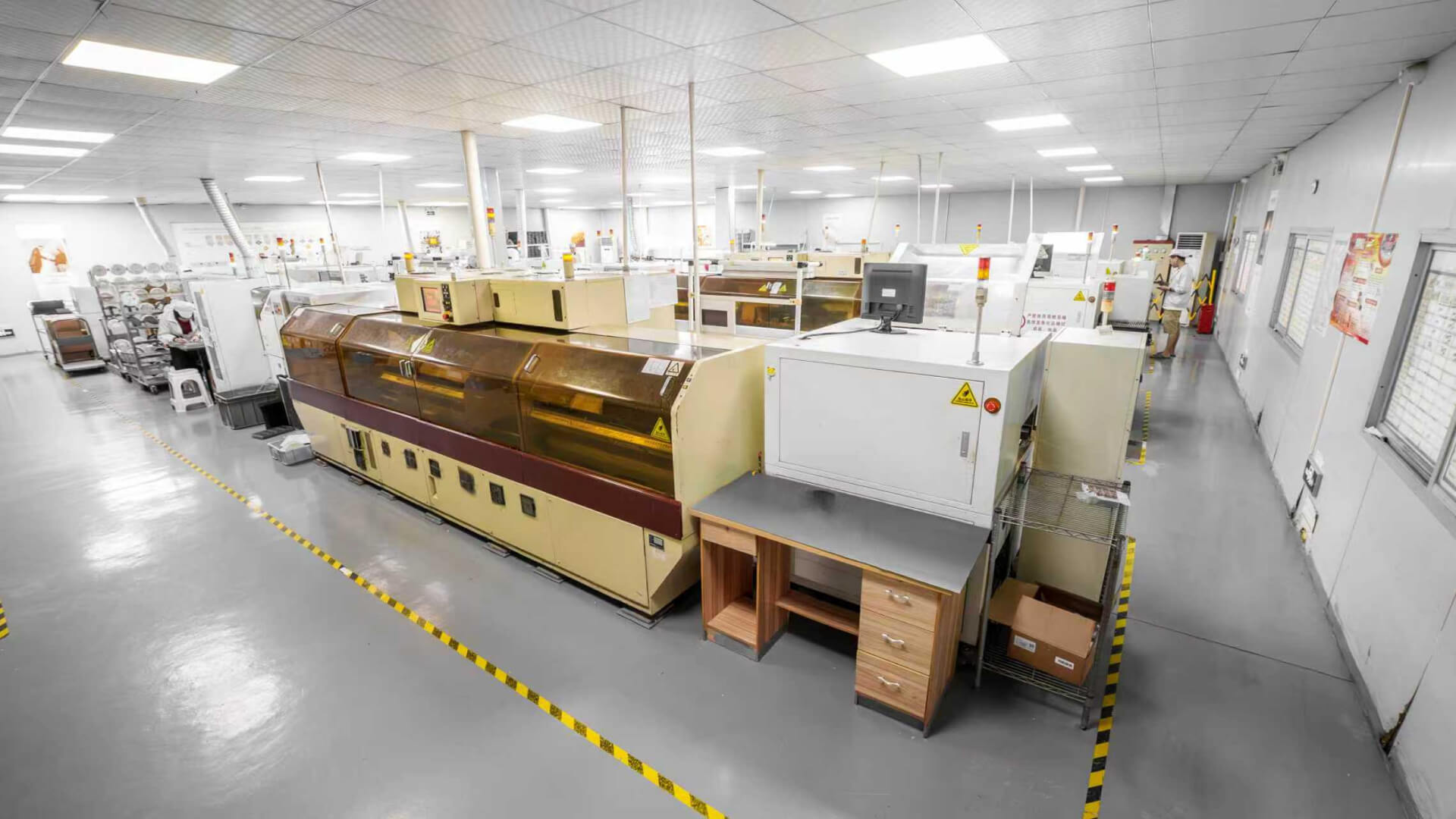 Lean manufacturing workshop employs U-shaped production lines with standardized operations. IPC-certified technicians perform through-hole soldering, wire assembly, and component integration. Anti-static flooring, ionizing fans, and climate control protect sensitive products. Visual management and Andon alarm systems provide real-time production visibility. Each workstation features electric tools, work instructions, and inspection standards. 100% self-inspection and mutual inspection ensure zero defects flow forward.